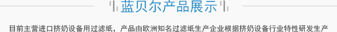 濟南藍貝爾工貿有限公司主要產品擠奶設備過濾紙,牛奶過濾紙,擠奶機過濾袋,目前主營進口擠奶設備用過濾紙,產品由歐洲知名過濾紙生產企業根據擠奶設備行業特性研發生產,產品符合歐盟食品接觸標準及FDA食品接觸標準,產品在擠奶設備過濾紙行業占有70%以上的份額。并通過了SGS標準技術檢測中心按國標食品級標準進行的檢測。產品適用于各種擠奶設備品牌,本公司目前獲得該區域產品營銷資格。產品已用于國內各大乳企所屬...